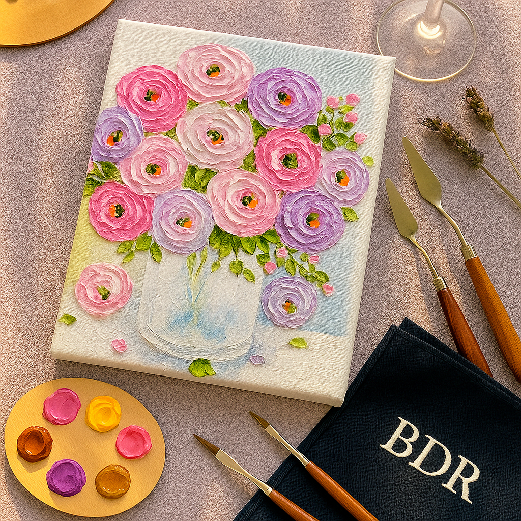 Create a charming bouquet with delicate textures and pastel tones using a palette knife. This workshop blends elegance and creativity for a soothing floral painting experience.